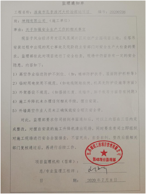 7月7日,集團公司總經(jīng)理宋道河帶領(lǐng)公司相關(guān)部門人員對正在建設(shè)的孔李淮河大橋治超站進行了專項安全檢查。宋總首先聽取了項目施工單位安全工作匯報,隨后又深入施工現(xiàn)場對安全工作進行實地檢查,檢查中發(fā)現(xiàn)部分施工人員未佩帶安全帽安全帶、樓梯扶手不牢固、接地窗戶無安全護欄、升降梯未安裝安全門等安全隱患。檢查結(jié)束后宋總現(xiàn)場要求施工單立即整改并要求項目管理部及監(jiān)理單位加強安全管理工作。監(jiān)理單位按照檢查情況向項目施工單位下達了監(jiān)理通知書,要求施工單位限期整改并開展項目建設(shè)安全工作自查自糾。次日,施工單位已按7月7日檢查要求及監(jiān)理通知單對項目安全隱患進行了整改。